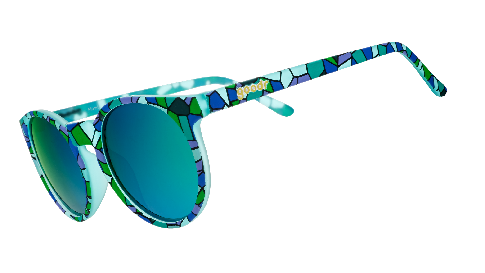 A beatnik appears on a hazy stage in stained glass-inspired teal Circle Gs w/ green reflective lenses to deliver slam poetry about the pitfalls of ugly, over-engineered active sunglasses. The audience snaps in support of their Moody Mosaic Musings.